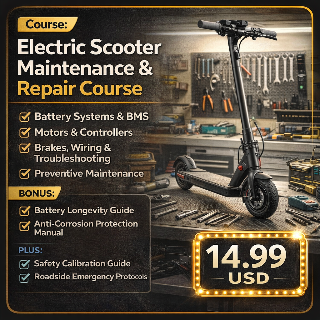 Eleven core modules covering every major system on a modern electric scooter, plus two bonuses and two complementary resources — all designed to give you a structured, complete understanding of how these machines work and how to fix them.
